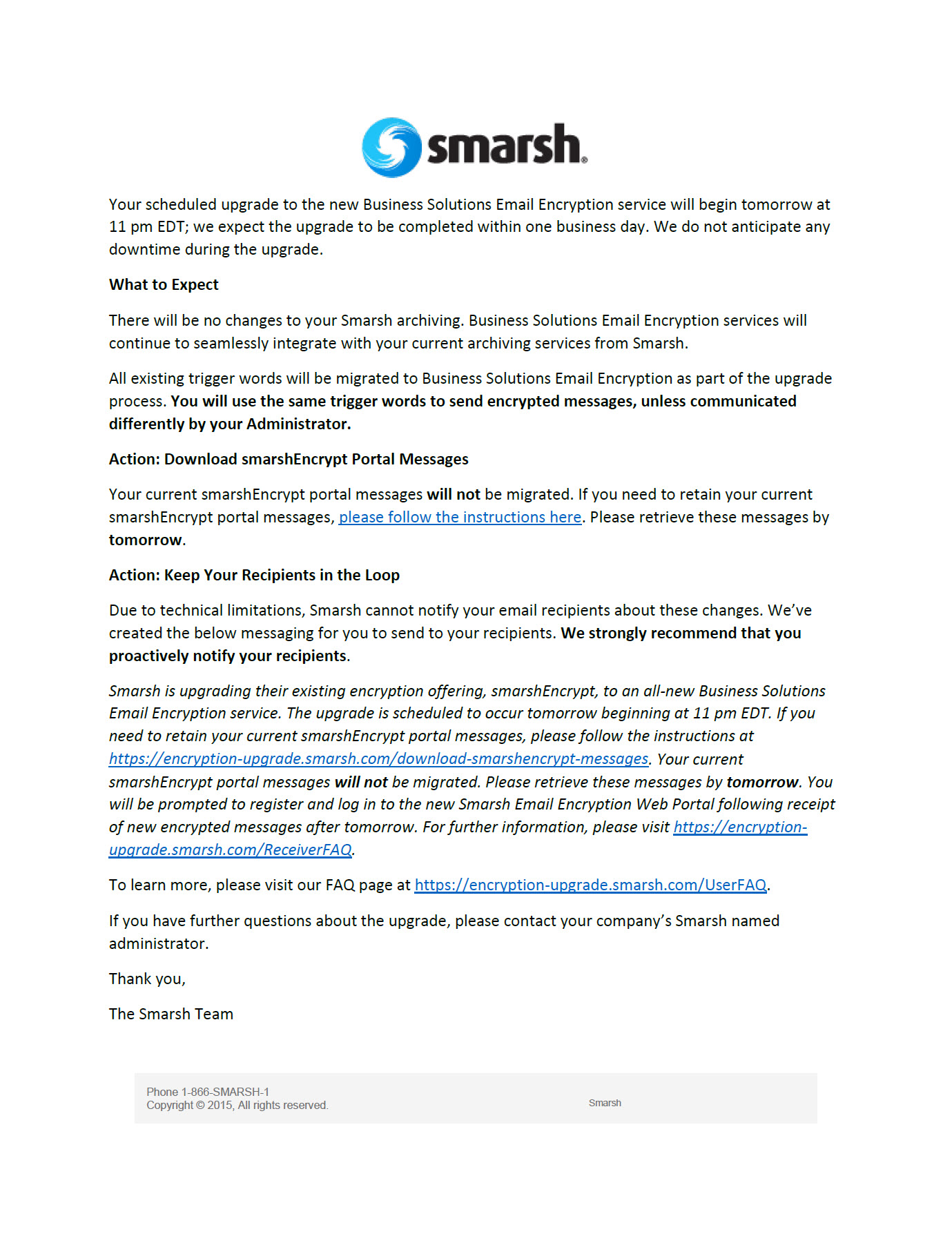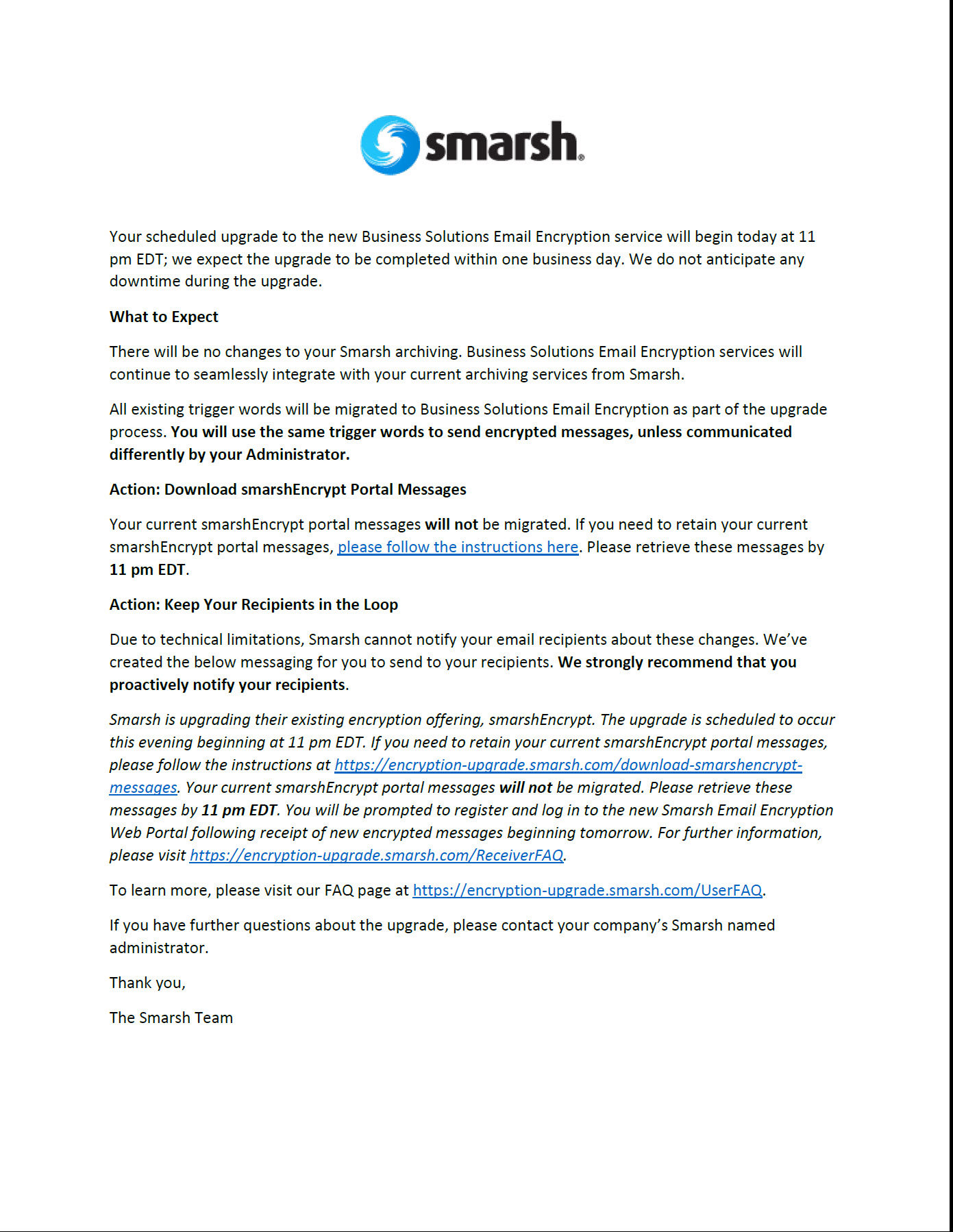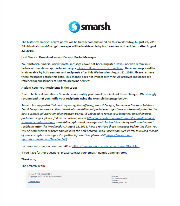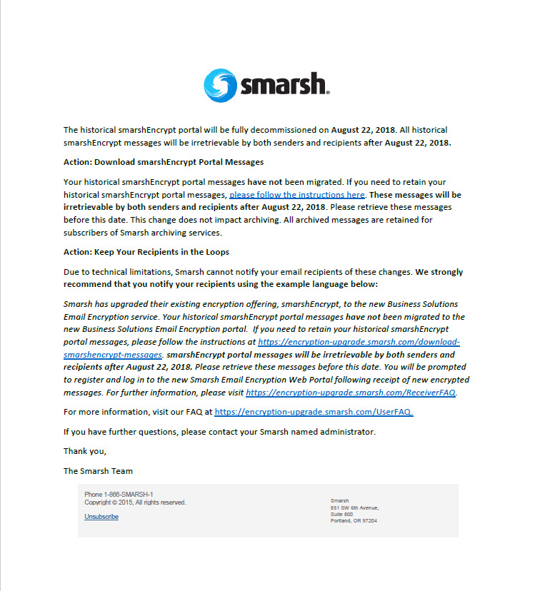 Smarsh is committed to providing clear and timely communications regarding your company’s email encryption upgrade. Communications regarding your approximate upgrade date, and more details for what to expect, will be sent throughout the upgrade process.